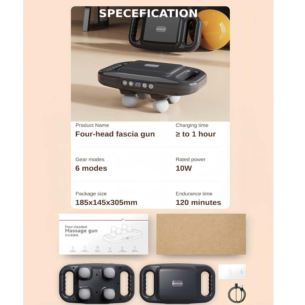 The 4-Head Massage Gun Deep Tissue is a professional-grade percussion therapy device designed to target muscle tension, soreness, and stiffness with precision and power. Equipped with four interchangeable massage heads (ball, flat, fork, and bullet), this massager allows you to customize your treatment for different muscle groups and sensitivity levels. The 20 adjustable intensity levels and 6 specialized massage modes provide a range of options from gentle relaxation to deep tissue penetration, making it ideal for athletes, fitness enthusiasts, and anyone seeking relief from chronic pain or muscle fatigue.Powered by a high-torque quiet motor, this massage gun delivers up to 3200 percussions per minute while operating at a whisper-quiet noise level, ensuring minimal disruption during use. The ergonomic design features a non-slip grip for comfortable handling, and the long-lasting lithium battery offers up to 6 hours of cordless operation on a single charge. The intelligent pressure sensor alerts you if excessive force is applied, preventing over-treatment and ensuring safety. Whether you're recovering from a workout, alleviating back pain, or relieving neck and shoulder tension, this device provides professional-level therapy at home.7 Bullet Points:4 Interchangeable Heads - For targeted muscle treatment20 Intensity Levels - From gentle to deep tissue penetration6 Massage Modes - Customizable routines for different needsHigh-Torque Quiet Motor - 3200 RPM with minimal noiseLong Battery Life - Up to 6 hours of cordless useIntelligent Pressure Sensor - Prevents over-treatment and ensures safetyErgonomic Design - Non-slip grip for comfortable use10 Product Keywords:Deep tissue massage gun4-head muscle massagerPercussion massagerBack pain relief massagerProfessional massage gunCordless muscle massagerHigh-intensity massage gunBody pain relief deviceQuiet massage gunInterchangeable head massager