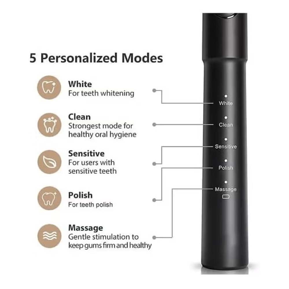 Upgrade your daily oral hygiene routine with this advanced Electric Toothbrush and Water Flosser combo set, a perfect all-in-one dental care solution designed for both home use and travel. Featuring a sleek, ergonomic design in elegant black, this cordless kit combines effective sonic brushing technology with the powerful precision of a high-pressure oral irrigator. The toothbrush offers five selectable cleaning modes—Clean, Soft, Massage, Polish, and Whitening—catering to a range of dental needs, whether it’s removing plaque, polishing enamel, or gently massaging sensitive gums. With up to 40,000 strokes per minute, the sonic vibrations ensure a deep clean every time, reaching areas that manual brushing can miss.Included are four high-quality brush heads that last up to three months each, providing you with over a year of maintenance-free brushing. The integrated smart timer encourages dentist-recommended 2-minute brushing, with 30-second interval reminders to switch quadrants, promoting balanced oral care. The companion water flosser features three customizable modes—Normal, Soft, and Pulse—ideal for cleaning between teeth, along the gum line, or around braces, implants, and crowns. The flosser includes four interchangeable nozzles, each designed to optimize performance and comfort, making it perfect for multi-user households.Both devices are fully waterproof (IPX7 rated), allowing safe use in the shower, and come with built-in rechargeable batteries that last up to 30 days on a single charge. A USB charging cable is included for universal compatibility, making it a practical choice for travel or business trips. Lightweight, compact, and cordless, this set ensures no tangled wires or bulky chargers get in your way. The low-noise motor and easy-to-hold design enhance your experience, while the dual functionality ensures a complete oral cleaning system—removing up to 99.9% of food debris and plaque when used together.Whether you’re aiming to brighten your smile, fight gum disease, or improve your overall oral health, this smart toothbrush and water flosser set offers professional-level care from the comfort of your home. Invest in your smile with this complete dental hygiene kit that combines technology, convenience, and powerful performance into one elegant solution.7 Bullet Points 2-in-1 Oral Care Solution – Combines electric toothbrush and water flosser for total dental hygiene. 5 Smart Brushing Modes – Clean, Soft, Massage, Polish, and Whitening functions suit all needs. 3 Flossing Modes – Normal, Soft, and Pulse settings ensure gentle yet effective flossing. Includes 8 Heads – Comes with 4 toothbrush heads and 4 flosser nozzles for long-term use. Rechargeable & Cordless – Built-in battery offers up to 30 days of use per charge; USB cable included. IPX7 Waterproof Design – Fully waterproof for safe use in the shower or during travel. Travel-Friendly – Compact, lightweight, and perfect for trips or business travel.10 Product KeywordsElectric ToothbrushWater FlosserOral IrrigatorCordless ToothbrushRechargeable ToothbrushPortable Water FlosserWhitening ToothbrushTravel Oral Care KitToothbrush with FlossWaterproof Electric Toothbrush