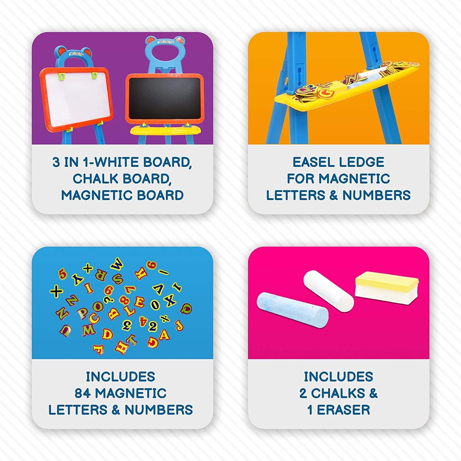 Description:The Kids' Art Station is a versatile 3-in-1 easel designed to spark creativity and inspire endless artistic possibilities. This adjustable easel features three interactive surfaces: a dry erase board, a magnetic board, and a chalkboard, offering children the perfect platform to explore drawing, writing, and imaginative play. Ideal for budding artists, the easel helps develop motor skills, creativity, and learning in a fun, engaging way.The height-adjustable design ensures that it grows with your child, providing years of creative enjoyment. Whether your little one loves drawing with chalk, practicing letters on the dry erase board, or experimenting with magnetic letters and numbers, this easel is an all-in-one educational tool. The sturdy construction ensures durability, while the built-in storage tray conveniently holds markers, chalk, and other art supplies, keeping everything organized and easily accessible.Perfect for homes, classrooms, or playrooms, the Kids' Art Station combines learning and play to enhance your child's development through creativity.Bullet Points:3-in-1 Design: Features a dry erase board, magnetic board, and chalkboard for a variety of creative and educational activities.Height Adjustable: Grows with your child, making it perfect for toddlers, preschoolers, and early school-age children.Built-in Storage Tray: Convenient tray holds chalk, markers, erasers, and other art supplies for easy access and organization.Durable & Sturdy Construction: Built to last, providing stability during drawing, writing, and play sessions.Encourages Creativity & Learning: Enhances motor skills, artistic expression, and early learning through interactive play.Keywords:Kids' Art Station3-in-1 Adjustable EaselDry Erase Magnetic ChalkboardArt Easel for KidsHeight Adjustable EaselCreative Learning EaselChalkboard and Whiteboard EaselKids' Drawing and Writing BoardEducational Easel for ToddlersMagnetic Board for Kids