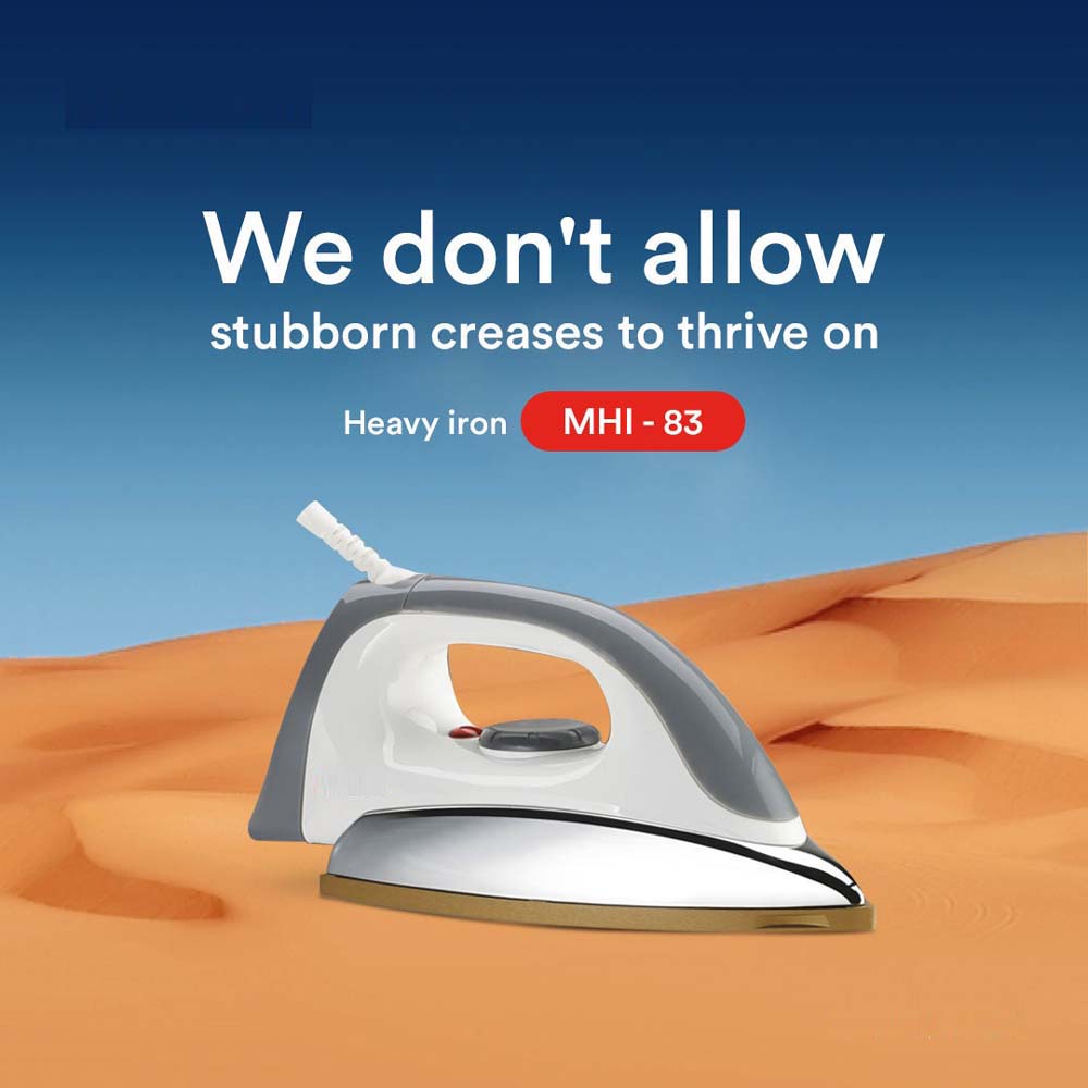 The MHI-83 Automatic Dry Iron redefines garment care with professional-grade performance for home use. Featuring a 1800W powerful heating element, this iron delivers instant, consistent heat that penetrates deep into fabric fibers for effortless wrinkle removal. The advanced ceramic soleplate glides smoothly across all fabric types without sticking or snagging, while its micro-steam holes distribute heat evenly for flawless results.Safety meets convenience with the auto shut-off feature that activates when left idle (30 seconds upright/8 minutes horizontal), preventing accidents while saving energy. The vertical steam function allows you to refresh hanging garments, curtains, and upholstery without an ironing board. The precision temperature control with LED indicator lights ensures optimal heat settings for delicate silks to sturdy denims, preventing fabric damage.Engineered for efficiency, the 1.8-meter swivel cord prevents tangling during use, and the anti-drip system stops water leakage at low temperatures. The extra-large water tank (300ml capacity) provides extended steam time between refills, while the self-cleaning function maintains peak performance by removing mineral deposits. Whether you're pressing dress shirts for work or refreshing seasonal storage wrinkles, the MHI-83 combines power, safety, and versatility in one sleek design.7 Bullet Points:1800W Rapid Heating - Professional results at homeCeramic Soleplate - Scratch-resistant smooth glideAuto Shut-Off - 30sec/8min safety featureVertical Steam - For hanging garments & drapesPrecision Temp Control - LED indicators for all fabricsAnti-Calc System - Self-cleaning functionLarge 300ml Tank - Less frequent refills10 Product Keywords:MHI-83 dry ironAutomatic steam iron1800W clothing ironCeramic soleplate ironAuto shut-off ironVertical steam functionProfessional home ironAnti-drip ironSelf-cleaning ironHeavy duty garment press
